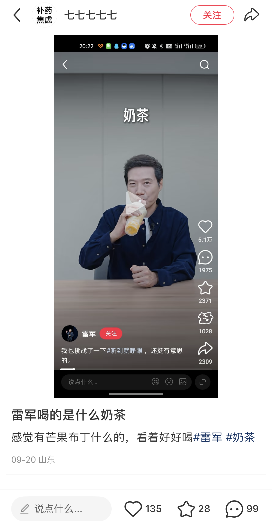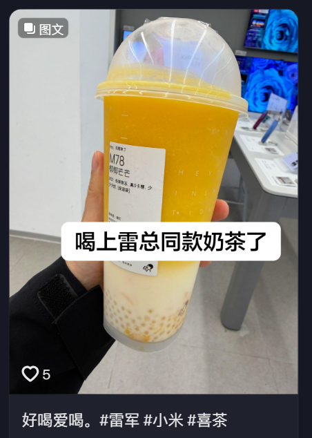 雷军在视频中展现的对奶茶的真实偏爱,与喜茶“日常化高端茶饮”的定位高度契合。这种非商业植入的自然曝光,比硬广更易引发大众共鸣,让消费者产生“企业家也爱喝的奶茶”的亲切感。眼尖的网友发现雷军喝的是喜茶“椰椰芒芒”,纷纷表示:“雷总都爱喝的奶茶,我也要尝尝”。