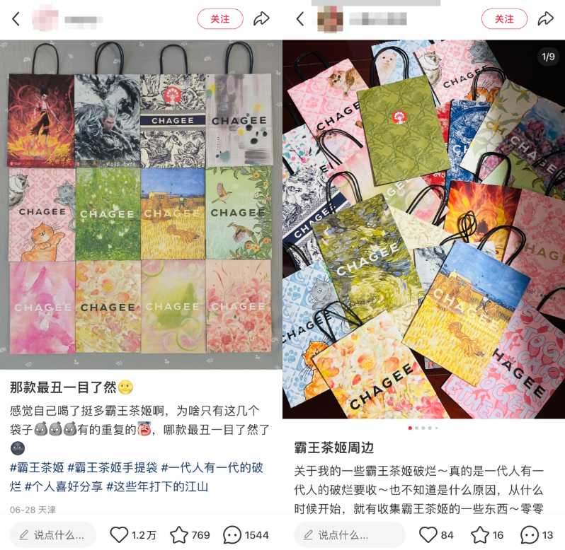 再比如,品牌根据季节限定,在杯子上做文章,让人赏心悦目,忍不住分享。比如霸王茶姬的杯子与纸袋,因为高颜值且充满东方韵味,就成了网友搜集与发社交媒体的搭子。