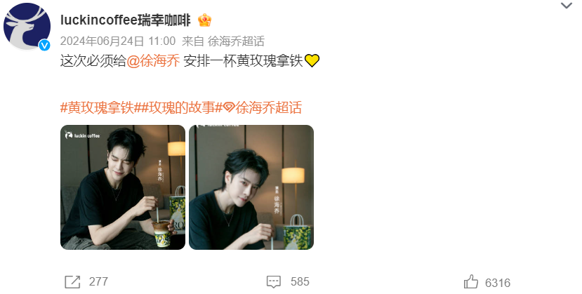 比如在瑞幸咖啡官宣与热播剧《玫瑰的故事》联名后,因未能参演而错失合作机会的徐海乔,被网友调侃为“编外男主”,相关话题迅速引发关注。瑞幸敏锐捕捉到这一网络热点,迅速“听劝”出手,在黄玫瑰拿铁上线时,顺势与“编外男主”徐海乔本人达成合作。这一波玩梗操作既幽默又迅速,不仅化解了网友的遗憾,更以极强的互动感和网感赢得了剧粉的广泛好评,被赞“最会玩的品牌”。