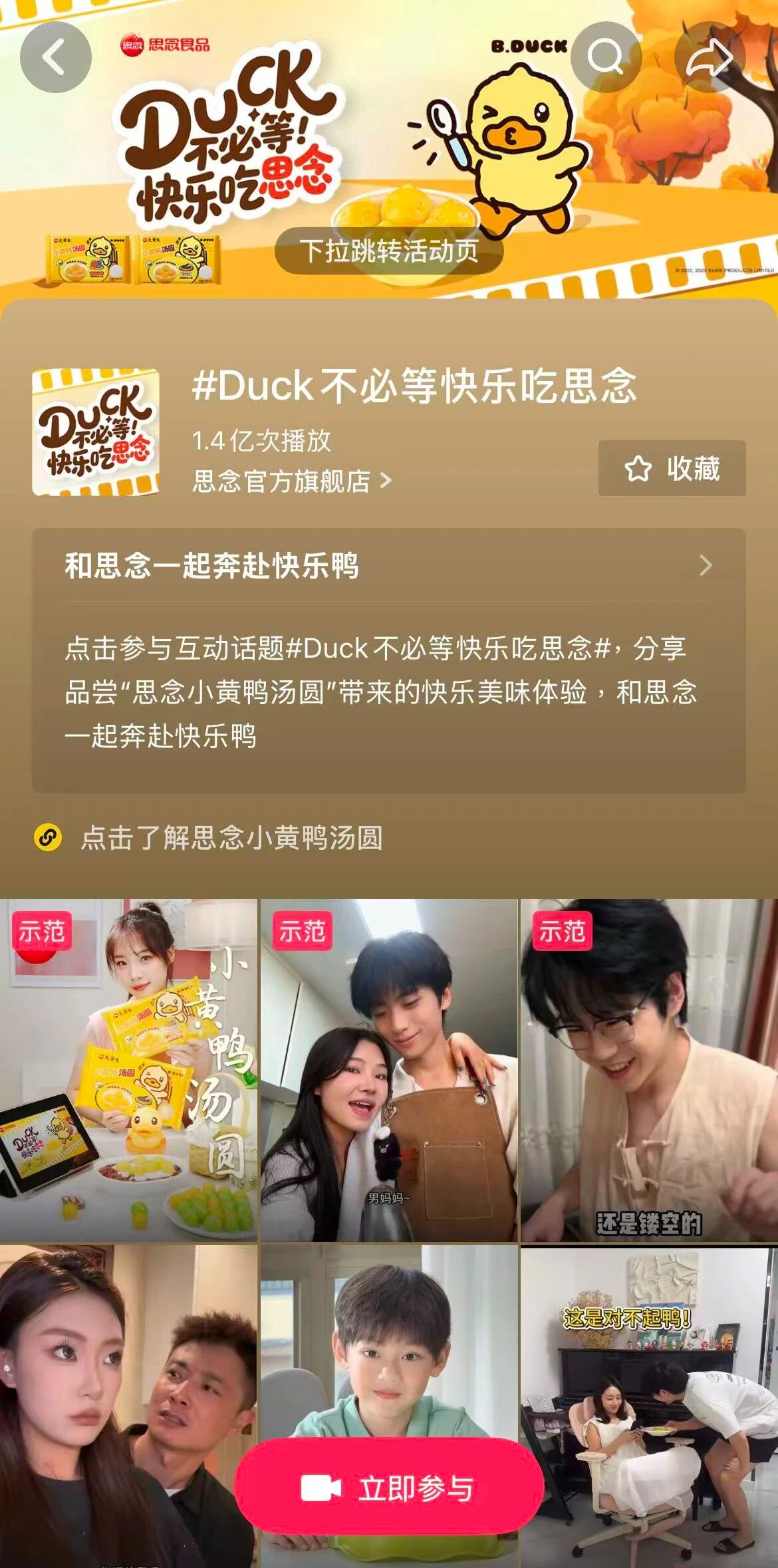 再如抖音平台,思念食品在官宣之后,先是上线了一支思念×Bduck小黄鸭汤圆创意视频带给年轻人快乐情绪,接着又在抖音上线互动话题和打造抖音星选任务,吸引全民参与到#Duck不必等快乐吃思念#话题中来提升新品上市的曝光扩散,持续拱热官宣联名事件在平台的传播热度。全民的参与与互动产生了大量的UGC内容,为思念食品快速引爆全网话题提供了坚实的基础。