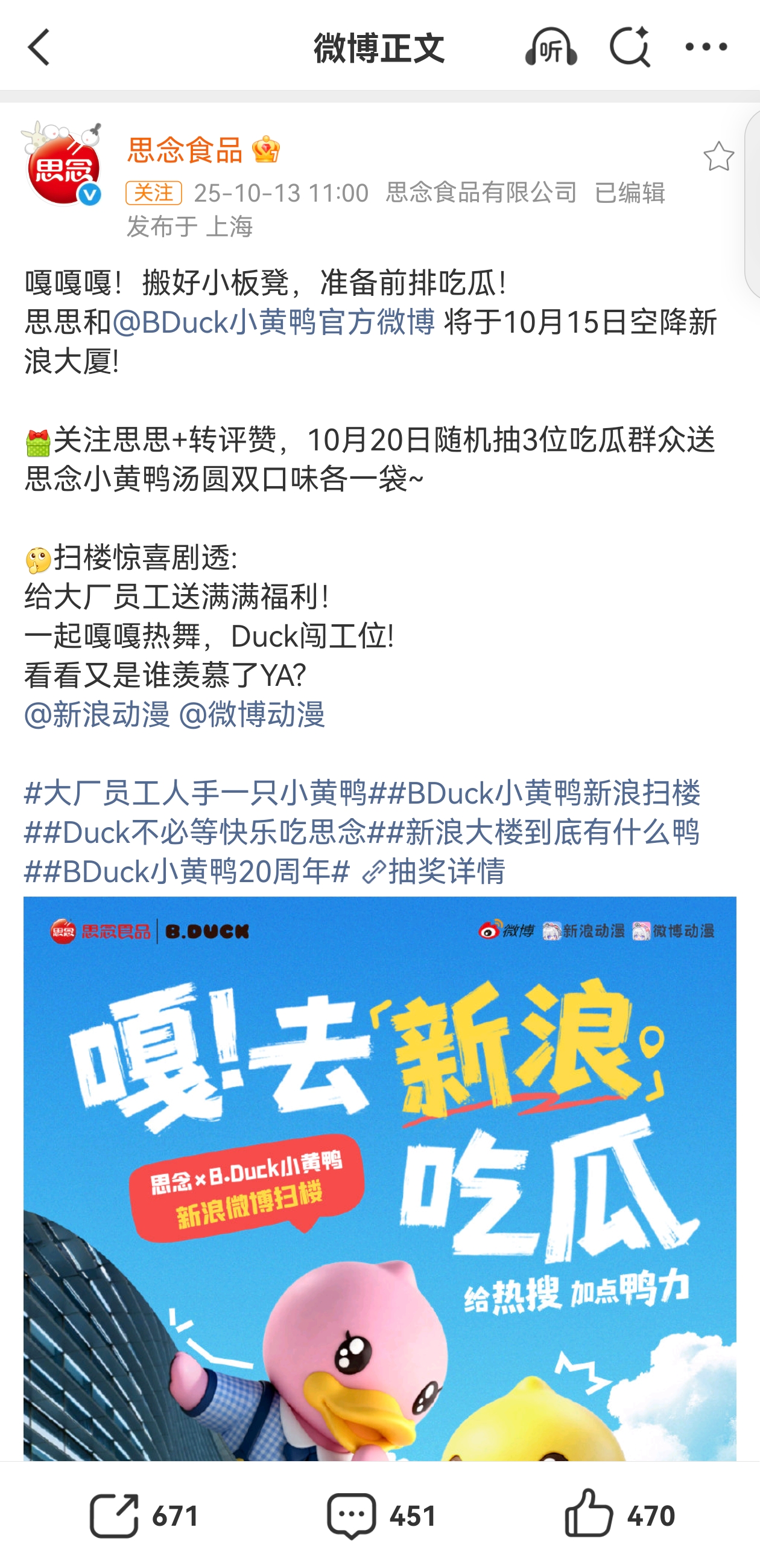 在整个传播周期中,思念食品联合小黄鸭在微博上同步展开日常运营与宠粉互动,顺着话题的热度进一步吸引着用户参与到#Duck不必等快乐吃思念#的话题互动中来。
