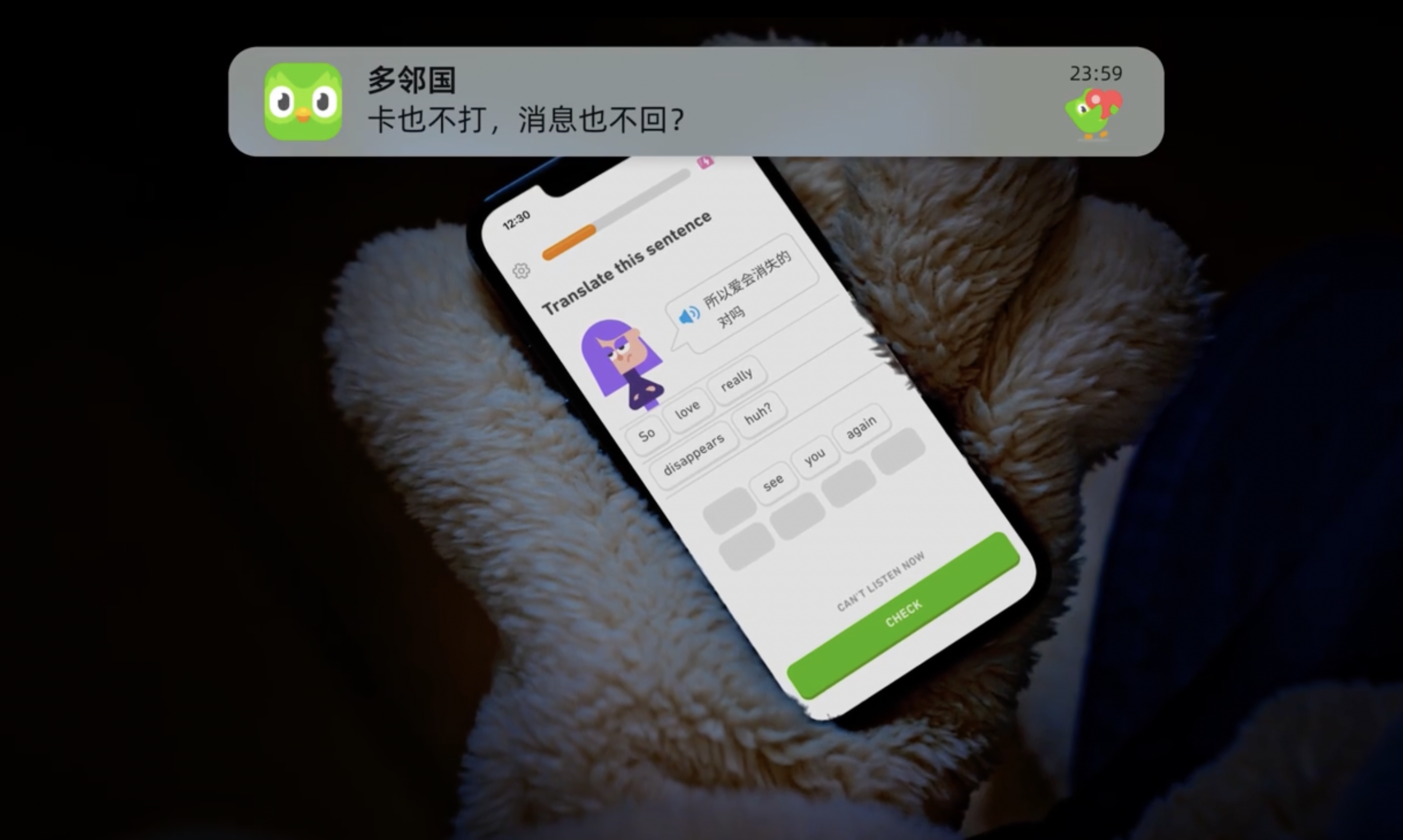 同时,多邻国还模仿《再见爱人》风格,推出了一支《爱是我们学不会的语言》的短片,将他们之间的问题一一展现,甚至发出了灵魂拷问「鸟鹿CP只是童话吗」「当热度褪去,爱的本质是什么」……