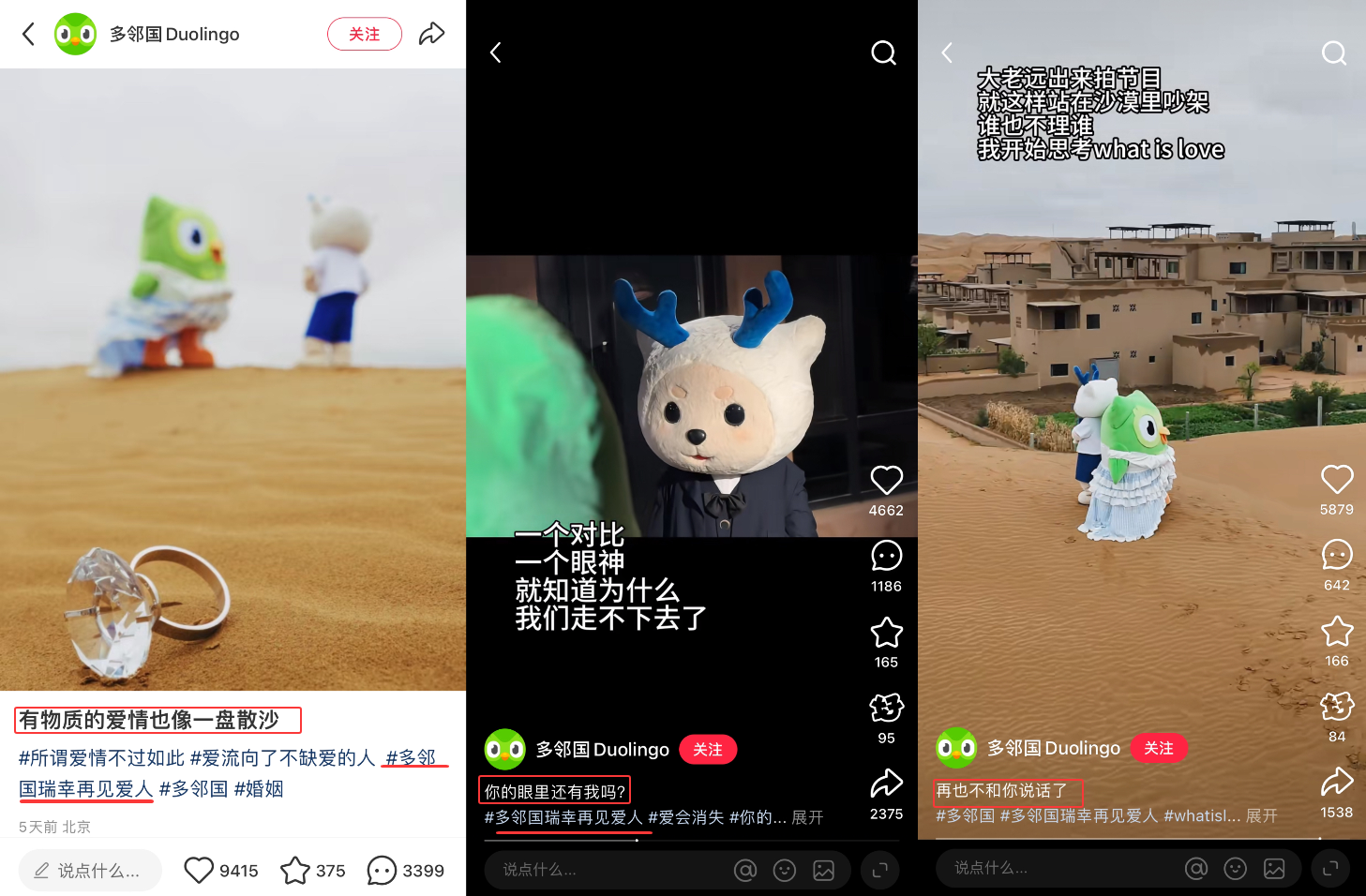 当社交媒体上传出瑞幸与多邻国婚变消息的时候,兵法先生赶紧去围观了一下,发现在《再见爱人 5》播出的前夕,多邻国发了一张带有「再见,爱人」文案的海报,同时在自己的“日常更新”中带上了话题#多邻国瑞幸再见爱人 #爱会消失 #你的眼神出卖了你 ,不爱了的韵味明显。