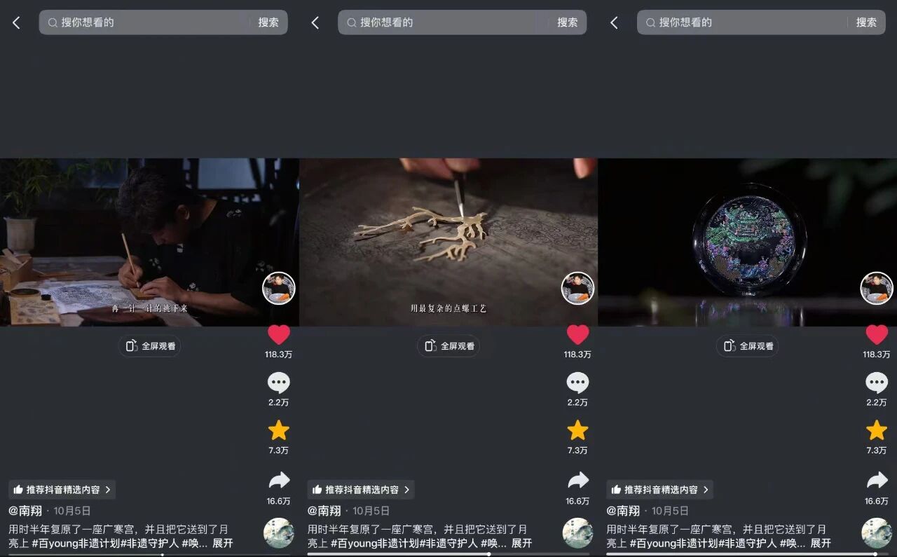 而本季「百young非遗计划」,除聚合上述非遗产物的相关视频内容外,还聚焦“螺钿”这项璀璨千年的镶嵌技艺,联动头部非遗达人@南翔 担任内容启动官,推出定制大片。视频紧贴时节氛围,通过螺钿技艺复刻中秋经典意象“广寒宫”,不仅再现传统工艺之精粹,更赋予非遗以强烈的时代感知与情感连接,让东方美学照进大众视野,再生华光。