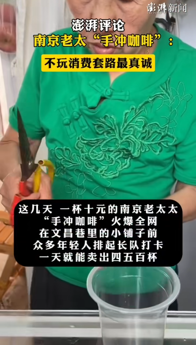 去年,“10元咖啡阿姨”突然火爆全网,众多年轻人排起长队打卡,一天就能卖出四五百杯。她的“手冲咖啡”可能和我们印象中的“手冲咖啡”不太一样,三条雀巢速溶咖啡加上老式开水壶的开水,再加上塑封手摇,一气呵成。