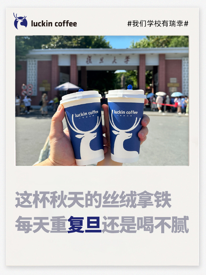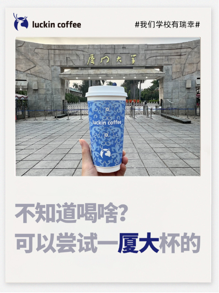 高校场景的布局,则体现了瑞幸对“年轻用户培养”的长远考量。截至2024年底,瑞幸在全国高校的门店数量已突破1444家。这些门店多选址在校园生活区、教学楼附近,适配学生的作息。瑞幸还针对学生群体推出专属优惠,进一步降低消费门槛。在北京大学、南京大学等高校,瑞幸甚至结合校园文化打造话题,比如“每天重复旦还是喝不腻”“可以尝试一厦大杯的”等趣味文案,成为品牌与大学生的沟通切入点。