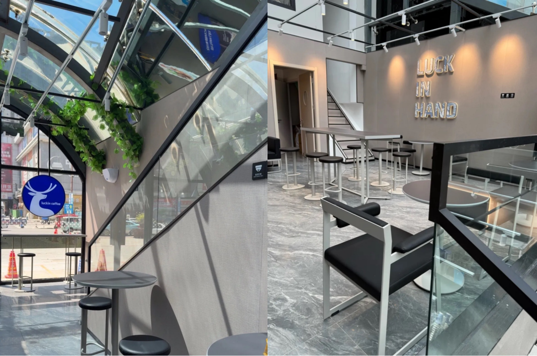 走进店内,上层区域利用天窗打造出“观景位”,消费者喝咖啡时能俯瞰街道人流,下层则聚焦快取服务,适配高频次的点单需求。这一具有辨识度的门店设计成了社交平台的热门话题,吸引很多用户拍照进店,让门店自带网红属性。