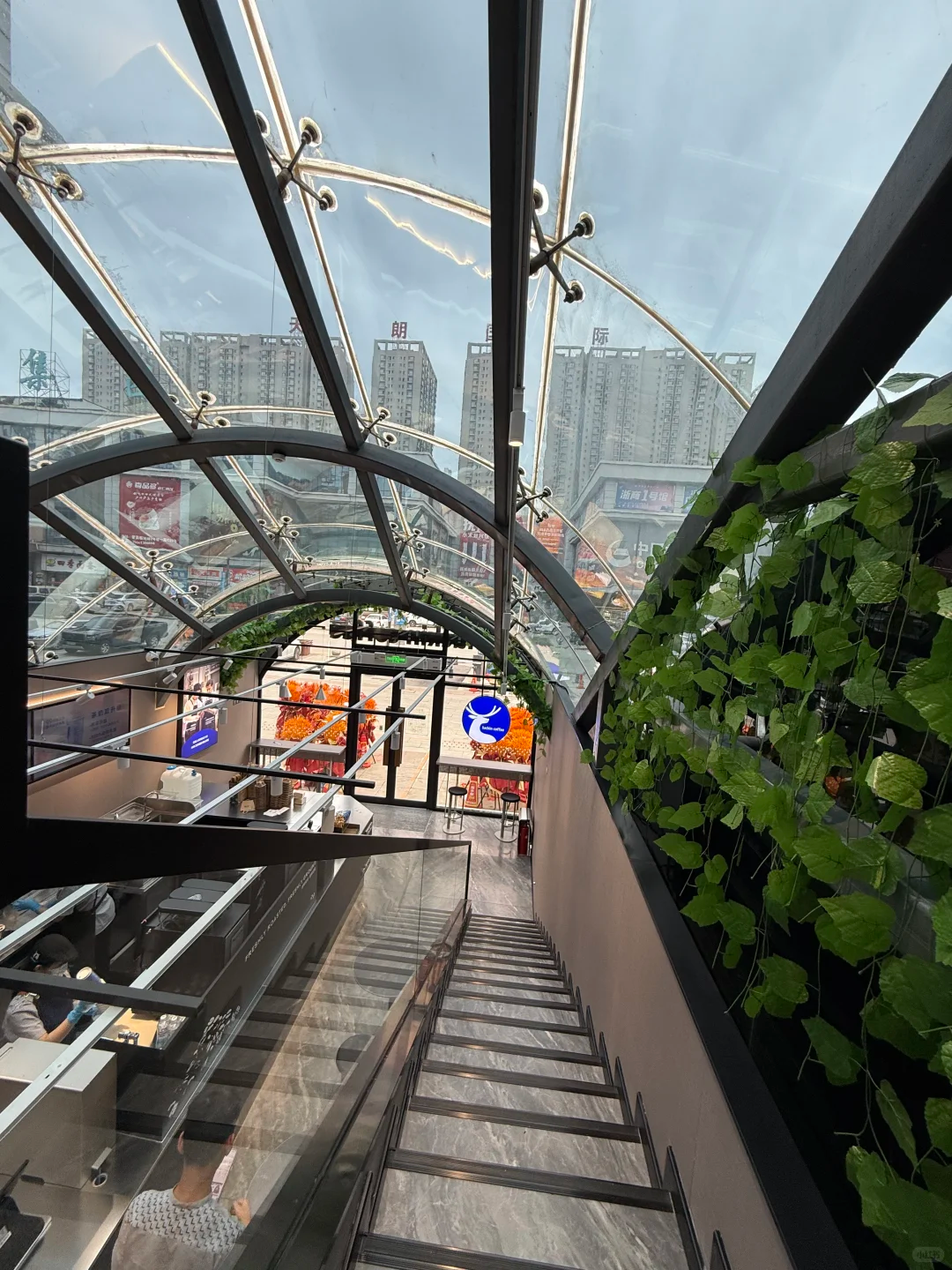 瑞幸最出圈的选址,莫过于对非常规载体的改造,将原本用于交通、服务的设施,变成了充满设计感的咖啡消费场景。其中,户外扶梯改造的门店堪称“空间魔术”!瑞幸拆除原有扶梯结构,在原地搭建起上下两层的门店,保留了扶梯原有的全景天窗。从外观上看,门店线条简洁,蓝白色品牌标识与透明玻璃形成强烈视觉对比,“悬浮感”的造型让它在商业街上格外醒目;