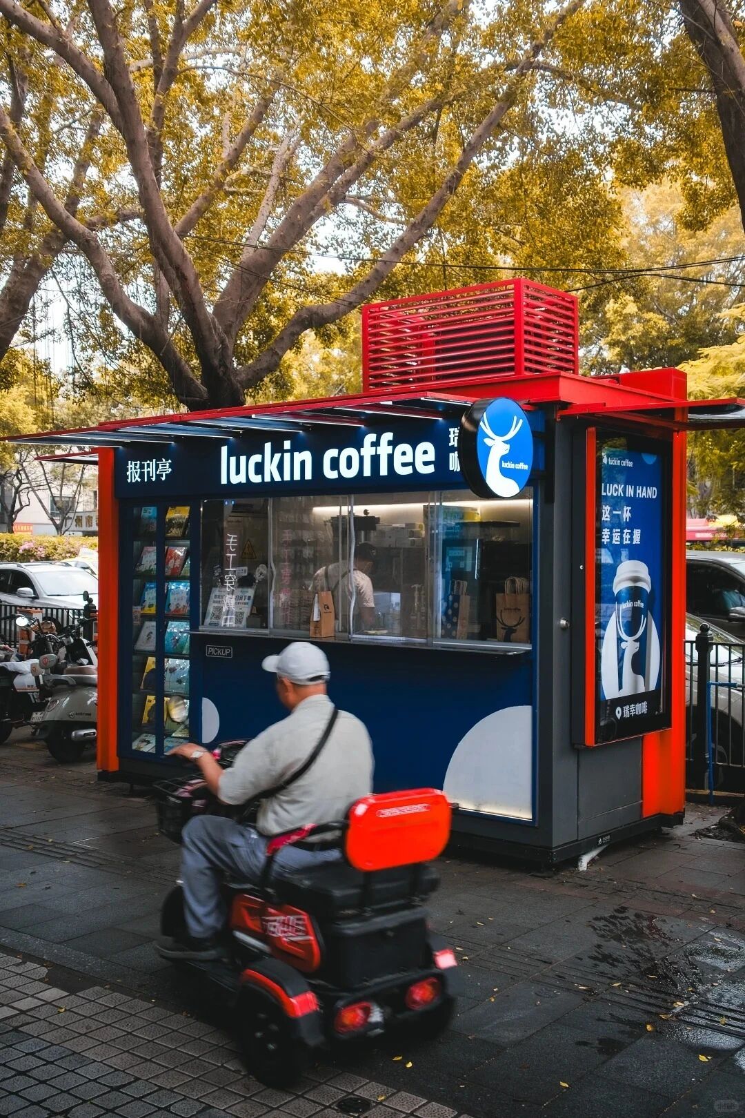 除了户外扶梯,瑞幸还把目光投向了更多“闲置载体”。报刊亭被改造成迷你快取店,蓝白配色的外观取代了传统报刊亭的杂乱,窗口的“扫码下单”标识精准适配年轻人的消费习惯;