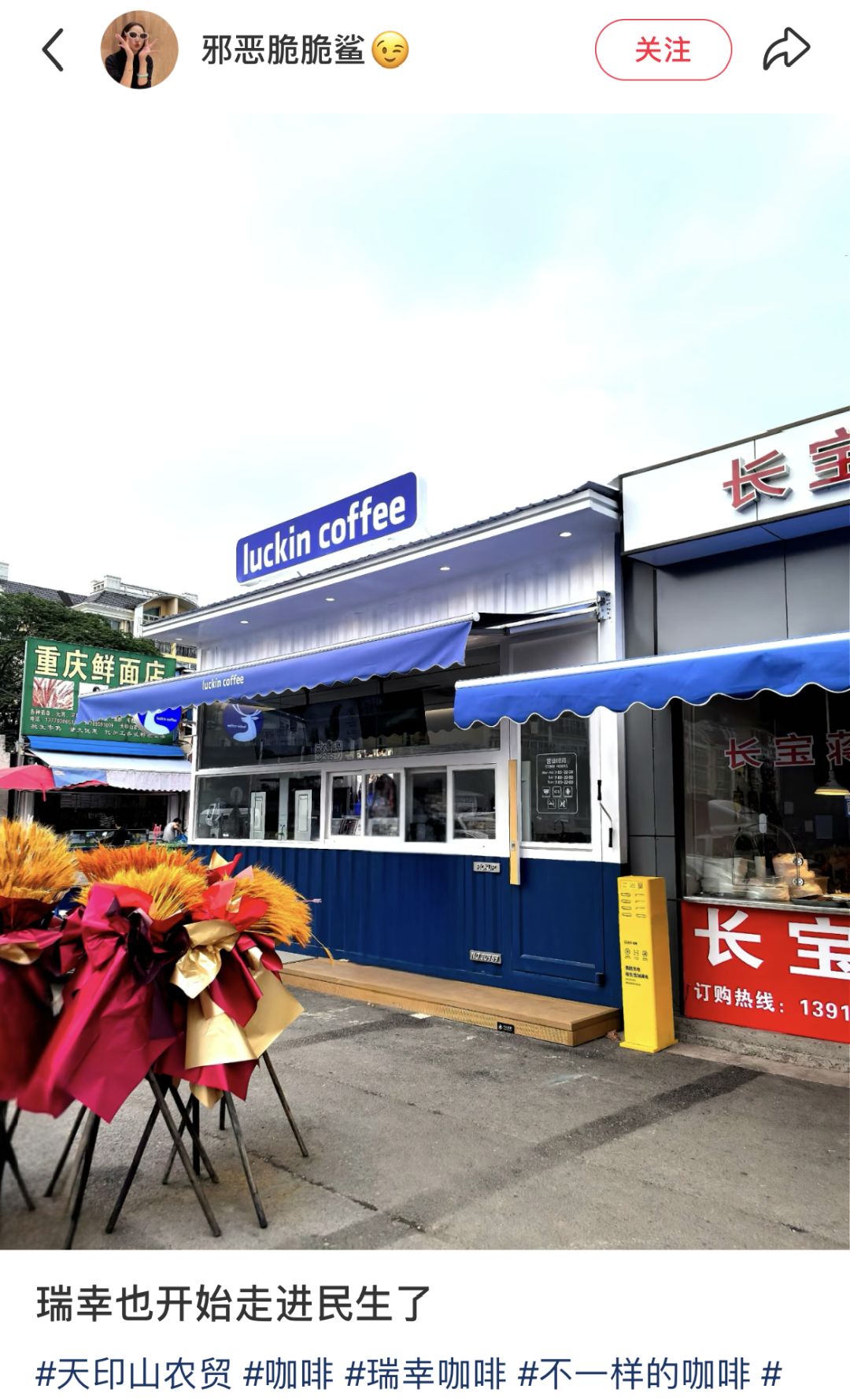 瑞幸的选址善于利用“反差感”制造话题,让每一个门店都成为用户愿意分享的“社交货币”。咖啡进入菜市场、村镇等充满烟火气的场景,本身就具有强烈的认知反差;户外扶梯、报刊亭这些非消费载体被改造成咖啡店,也容易引发用户的好奇心理。这些反差感,会驱动用户主动在小红书、抖音等平台分享体验。