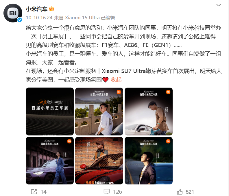 这场车展不仅让员工们玩得开心,其实也在不经意间秀出了小米汽车骨子里的基因,让很多消费者看到,原来造小米汽车的,是一群真正热爱驾驶、喜欢汽车的人,对品牌的“信任感”,就这么自然而然地建立起来了。