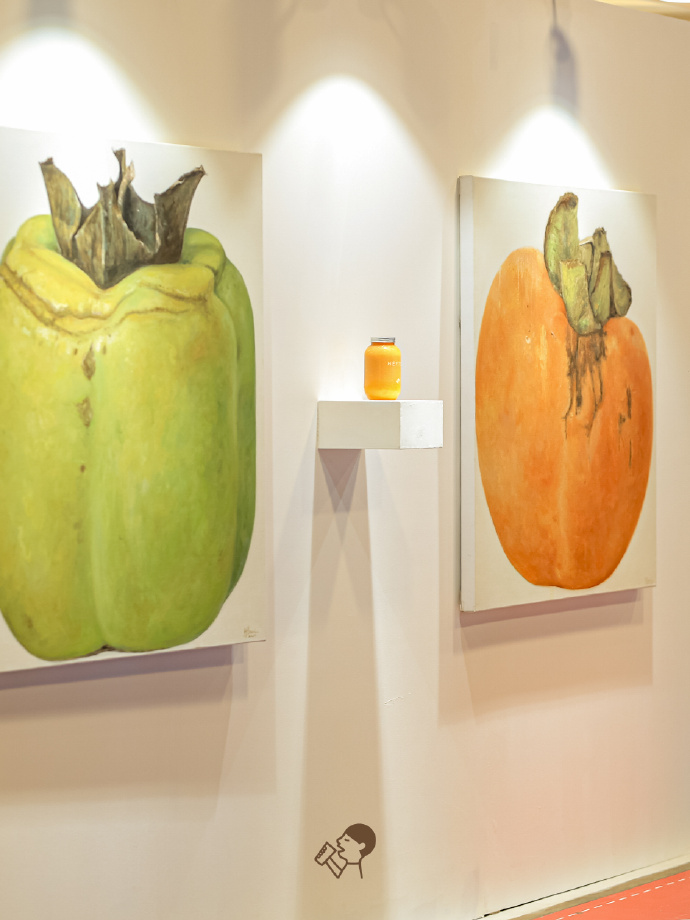 展览的核心是“柿子的一生”,易辉用画笔记录了柿子从青涩、成熟到腐烂的完整变化历程,而且他的创作理念也非常纯粹——想要还原那种喝着喜柿多多,在秋日公园里发呆的平静与温柔。