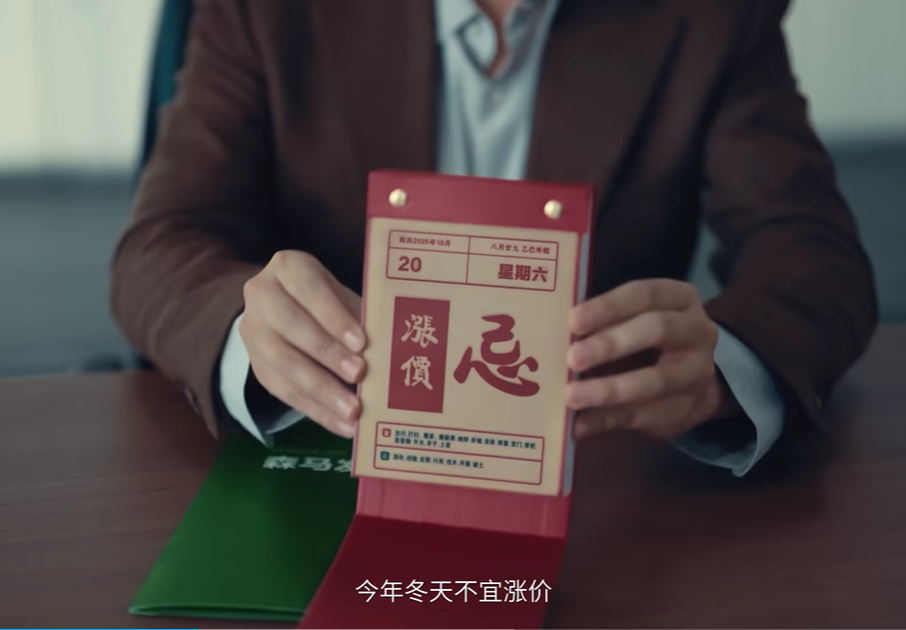 眼看常规理由行不通,工作人员又拿出了“企业发展计划”:“今年的企业发展计划书上说可以根据情况适度涨价。” 本以为有了书面依据,涨价之事就能尘埃落定,可土豆却掏出了一本黄历,一本正经地说道:“黄历上说今年冬天不宜涨价。”这一荒诞的举动,瞬间将广告片的喜剧氛围推向了一个小高潮。用“黄历”这种充满传统色彩又略带迷信的元素作为反涨价理由,既出人意料,又充满了反差萌,让观众忍不住感叹“还能这样玩”。