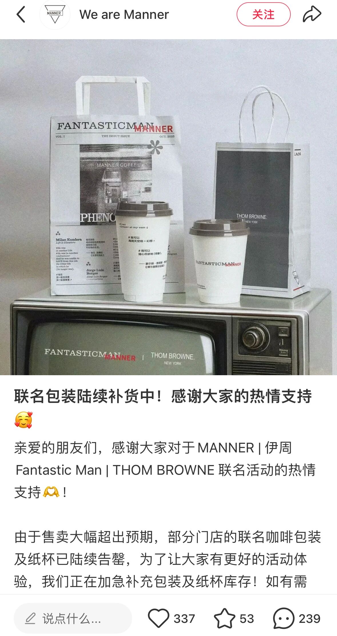 这时候,品牌贴心的出来安慰着这波牛马打工人,表示其:由于售卖大幅超出预期,部分门店的联名咖啡包装及纸杯已陆续告馨,为了让大家有更好的活动体验,正在加急补充包装及纸杯库存!