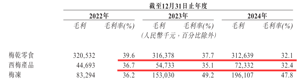 与此同时,核心产品的毛利率持续下滑,梅干零食从2022年的39.6%降至2024年的32.1%,西梅产品从36.7%降至32.4%,盈利压力越来越大。