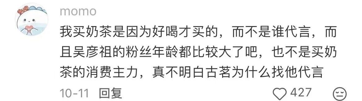 古茗与吴彦祖合作的“包装袋翻车”事件,本质上是一场“错配”的营销悲剧。品牌用传统明星代言思维应对Z世代的消费逻辑,用敷衍的视觉呈现挑战年轻群体的审美底线,用短期蹭流的心态取代长期价值的构建。反观喜茶、三得利等品牌的成功案例,无论是潮汕如姨的“烟火气共鸣”,还是成毅的“调性契合”,其核心都在于实现“明星、品牌和消费者”的价值同频。