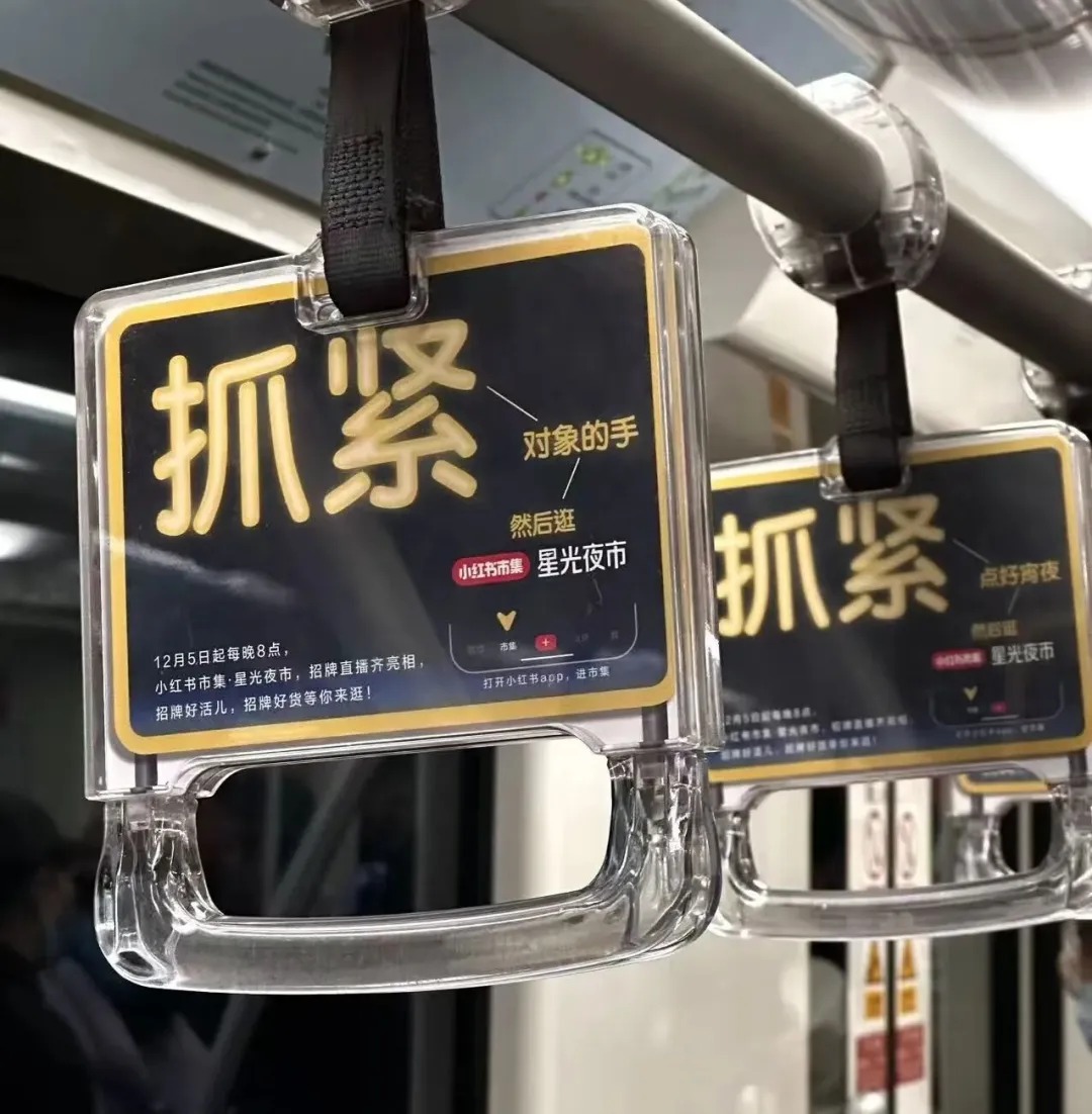 前不久,小红书上线了一组线上夜市直播活动的地铁拉环广告,内容围绕“抓紧”做创意,一语双关,既是抓紧扶手,也是抓紧时间,让人们立刻get到品牌是懂打工人的。