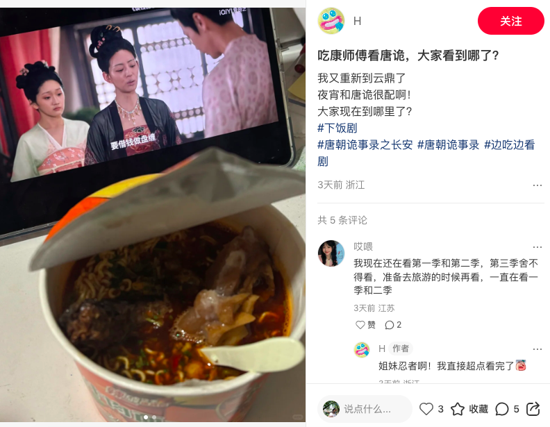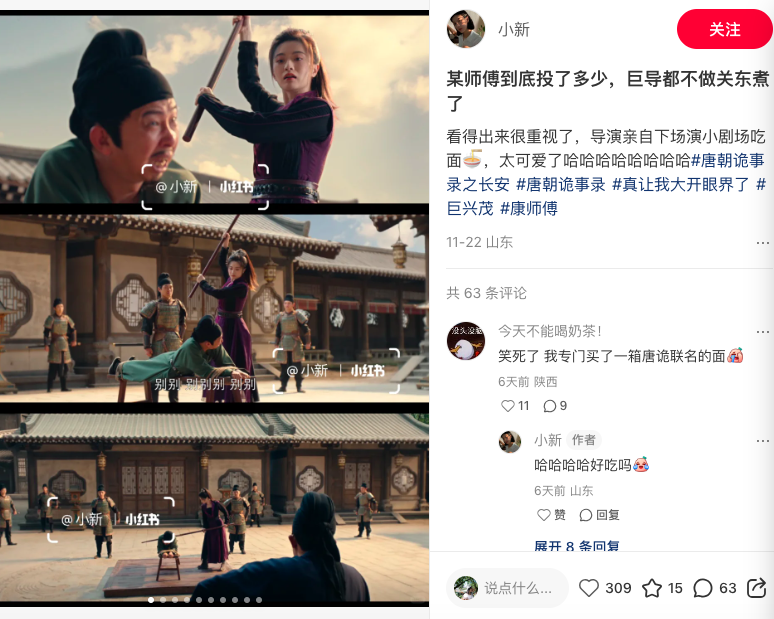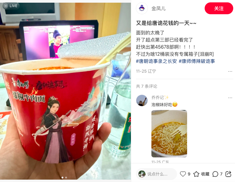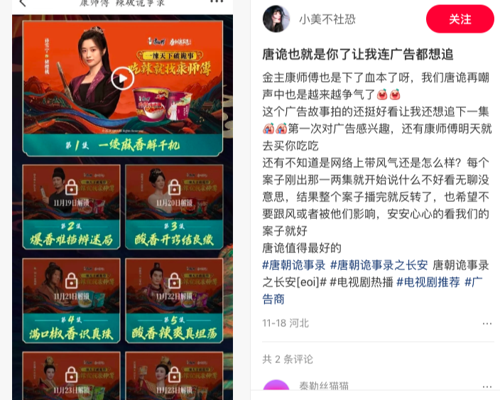就当前形势来看,中国传统饮食文化正成为这场转变的关键支点。它为品牌提供天然情感纽带,让企业跳出产品竞争,用文化密码对话年轻人。近期,康师傅与热门影视IP《唐朝诡事录》(下简称“唐诡”)的营销实践,也再次证实这一点:以文化为基,以共创为桥,品牌才能在心智博弈中站稳脚跟,让营销从流量收割变为价值沉淀。