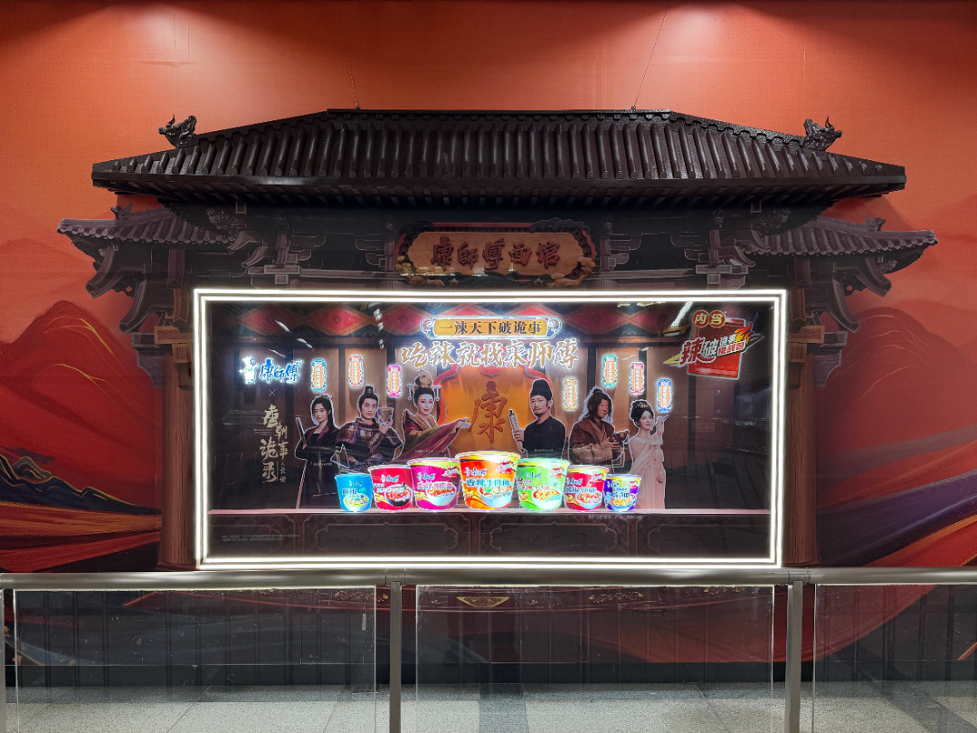 不止于此,12月初,康师傅还将剧中虚拟的“康师傅面馆”搬到唐诡IP系列故事的历史原点,在西安大雁塔地铁站打造的沉浸式主题车站。