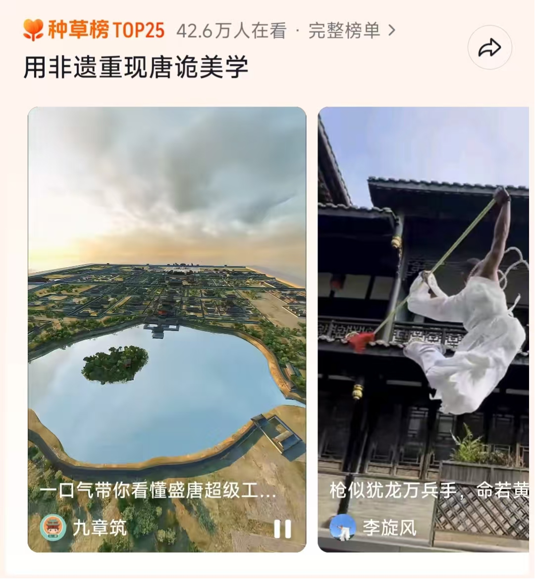 以唐诡为例,剧集中从服化道的纹样设计到场景搭建的榫卯结构,从配乐中的传统乐器到台词里的诗词典故,无不浸润着中国传统文化的美学底蕴,让观众在追剧时沉浸式感受中式美学的魅力。即便唐诡已完结多时,#用非遗重现唐诡美学 的热搜仍有超40w人在看。