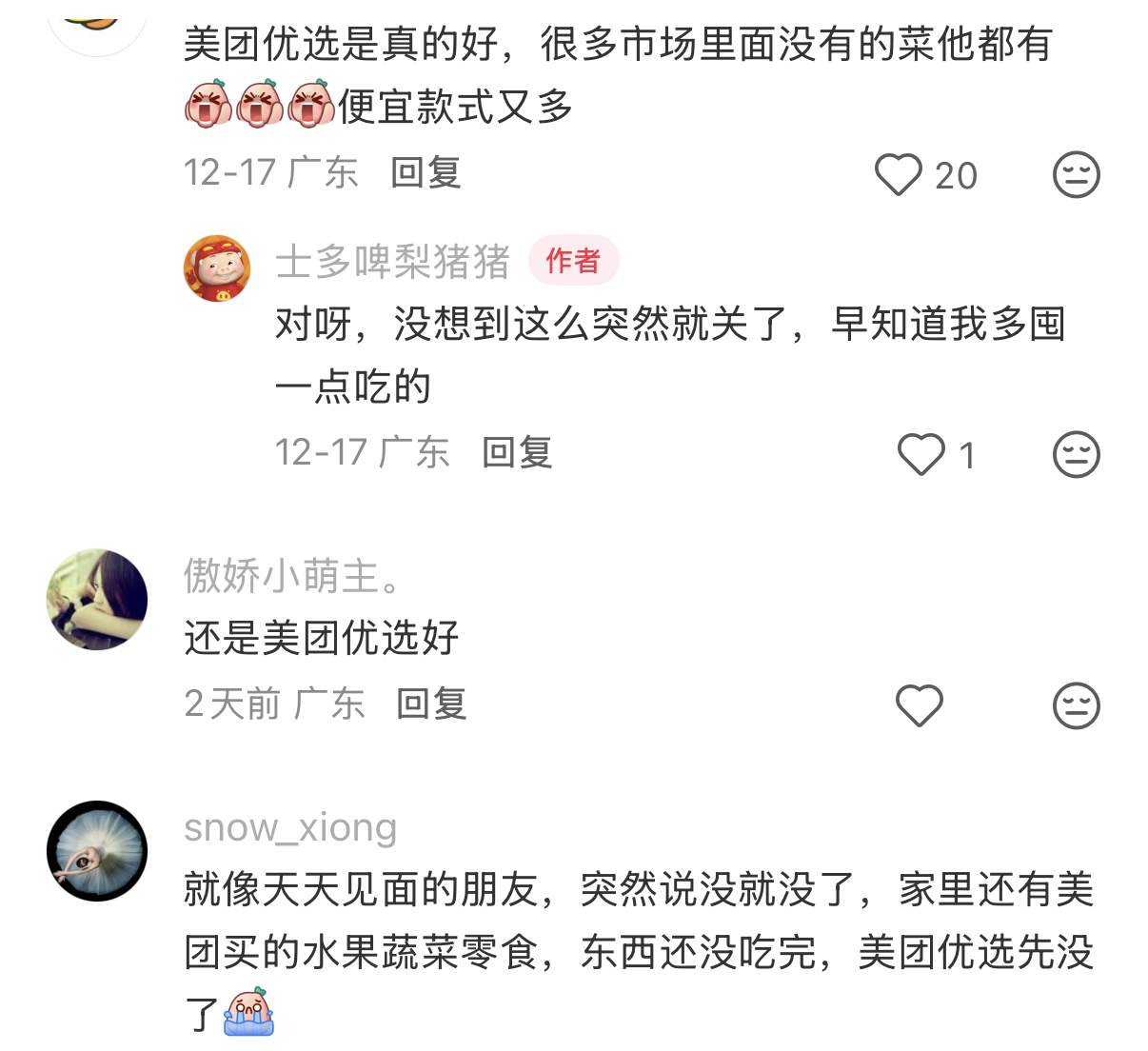关停消息一出,社交平台直接被用户的惋惜声淹没。“天塌了!以后再也买不到13.9元30个鸡蛋了”“美团优选你快回来啊,品类多还便宜,突然说没就没了”“早知道要关,我肯定多囤点洗衣液和水果,现在只能去超市当冤大头”“真的舍不得,只有这里的菜卖得划算,补贴停了都没舍得删APP,没想到直接关了”……无数用户在评论区刷屏“求恢复”,有人晒出五年间的下单记录,有人吐槽超市同款青菜比优选贵一倍,字里行间全是对低价便利的依赖。这些声音恰恰印证了美团优选曾经的成功——它确实用低价抓住了用户痛点,但也暴露了营销的致命缺陷:只靠价格绑定的用户,在平台退场时再不舍,也只能被动接受。