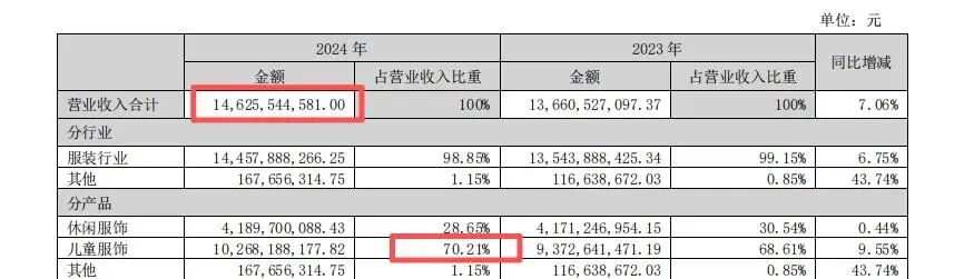 集团资源的倾斜更成为巴拉巴拉的“隐形翅膀”。当森马休闲装业务受ZARA等快时尚品牌冲击陷入增长乏力时,集团将优质供应链、研发与营销资源优先供给童装板块,使其成为业绩增长的“压舱石”。2017年,巴拉巴拉营收首次超过森马休闲装业务,此后占比持续攀升至2024年的70.21%,完成从“副业”到“支柱”的身份逆转,也真正成为家喻户晓的童装国民品牌。