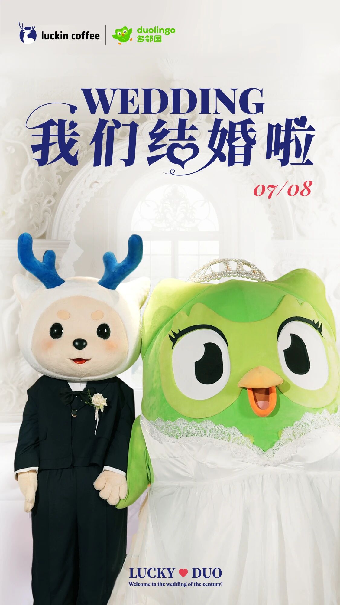 瑞幸将品牌以拟人化的方式与多邻国组合成新婚CP,邀请大众参与这场“世纪婚礼”,和大家玩在一起,也展现出瑞幸鲜活且擅长玩梗的品牌人设。不得不说一句:瑞幸真会玩。