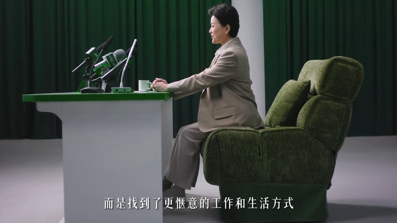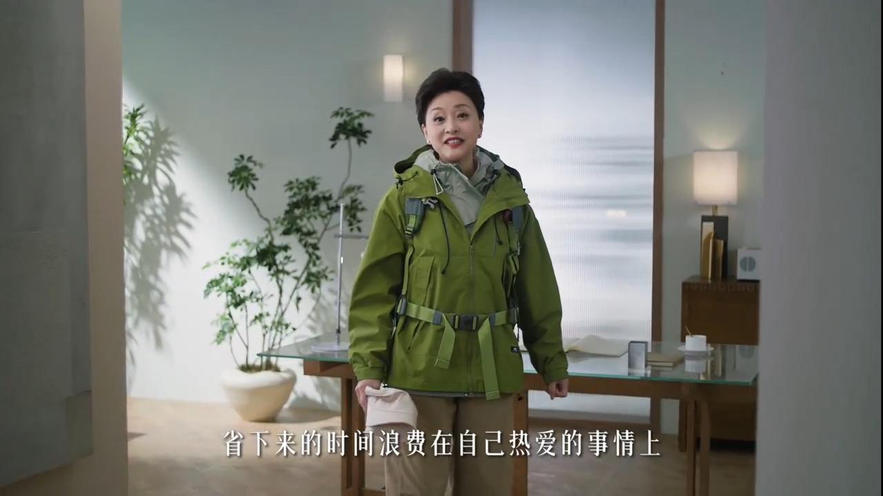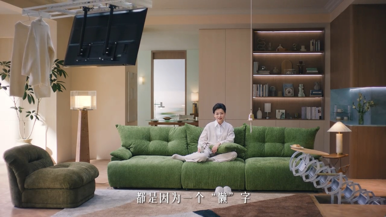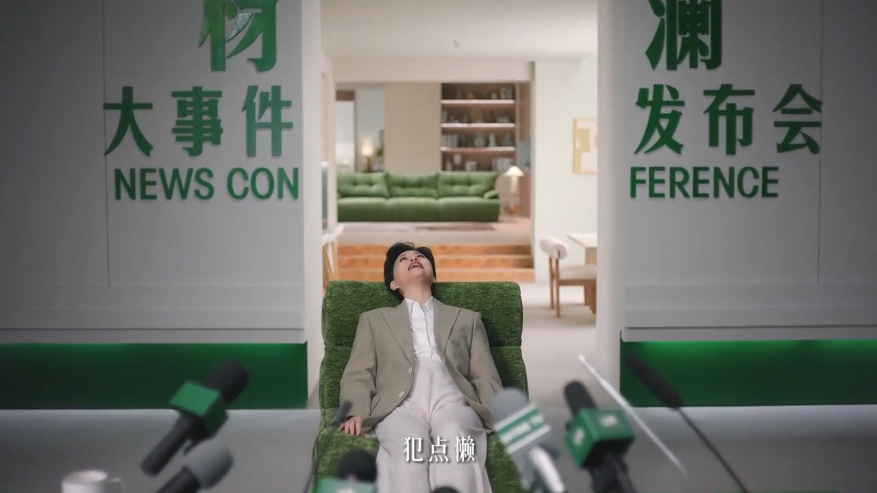 比如在短片中,上半身穿着精致主播上衣的杨澜,下半身竟然是毛茸茸的拖鞋和家居裤。而且所谓的“发布会”背景墙一拉开,后面竟是杨澜的家?短短一个镜头,就完成了“在线营业”到“下线回家”的切换,观众心情也是瞬间从紧绷变成了惬意。