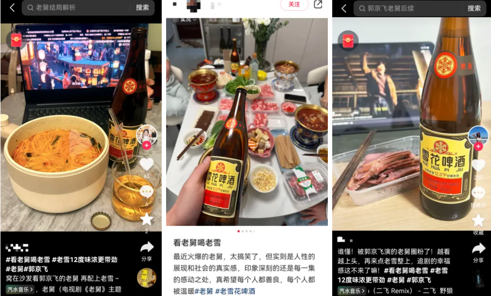 其实《老舅》迎来大结局以后,很多观众表示后劲太大、意难平。而一路陪老舅走过来的老雪啤酒,恰恰承接了这份未尽的情绪,成为了观众理解老舅、纪念老舅的情感媒介,抖音、微博、小红书等社交平台上也有不少用户晒出看老舅和老雪的打卡内容。当一部剧结束,真正留下的或许从来不是台词或情节,而是那些与角色共享过的情感共振,而12度的老雪正是其中的关键注脚。
