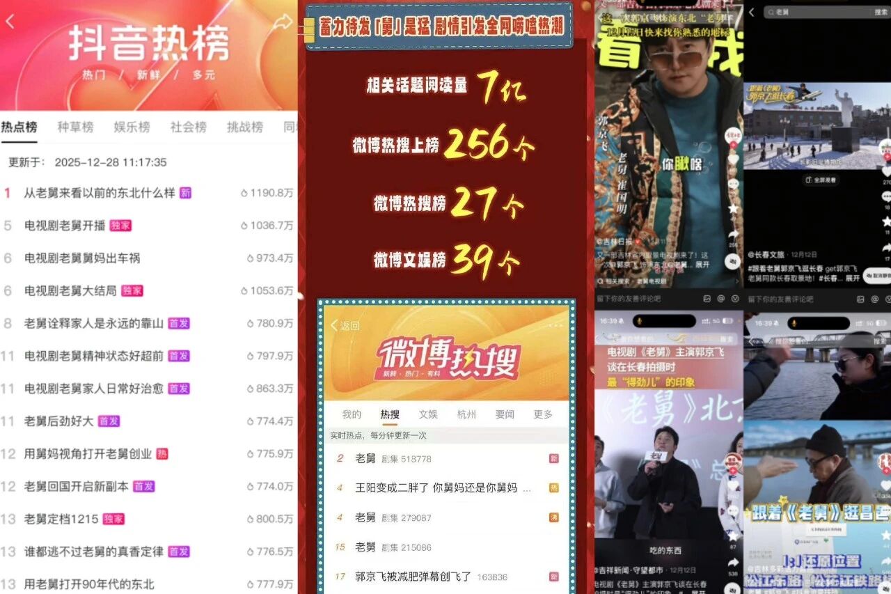 这部剧最近太火了,刚一开播,收视率就冲上全国第一,全端播放量累计突破9亿,豆瓣开分稳稳拿下7.6,是2025年开分最高的年代家庭剧。在抖音,主话题播放量飙到32亿,登上热点147次;微博热搜更是上了256回,从剧情到台词轮番刷屏,成了开年最出圈的国民剧之一,连地方文旅都在自发打call。