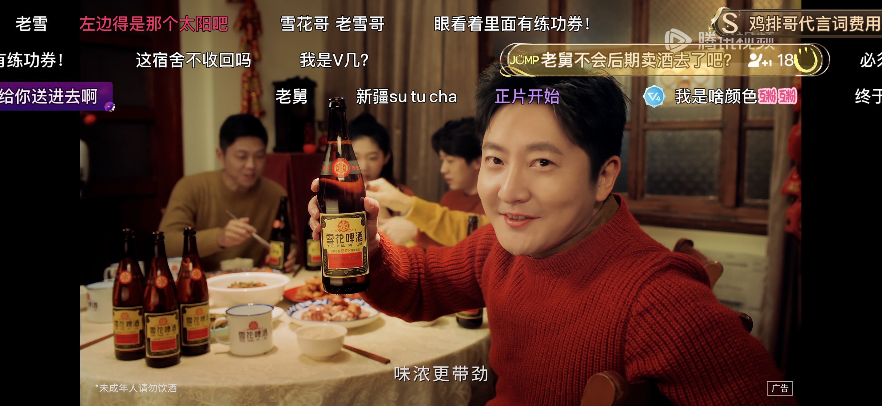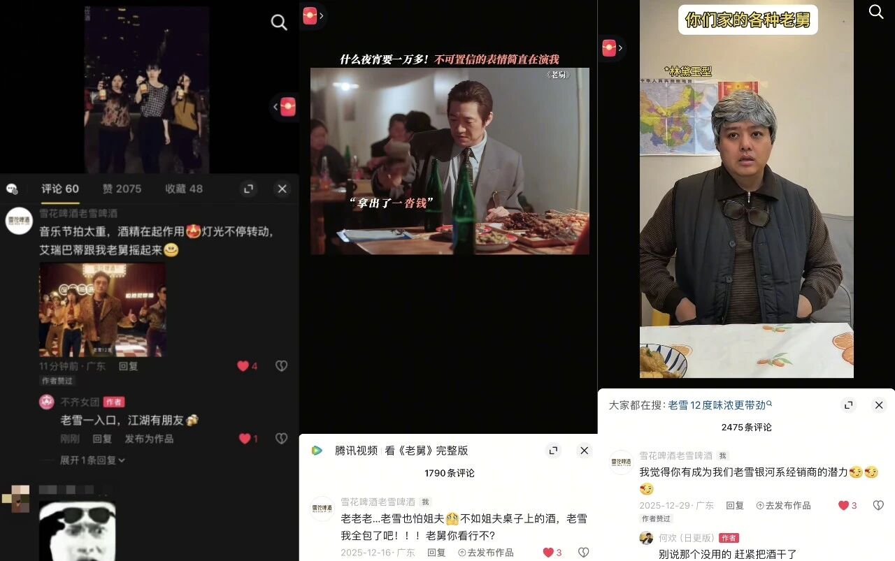 在《老舅》中,老雪定制了三支创意中插——《烧烤篇》《年货篇》和《disco篇》,每一支都能精准呼应老舅的人生片段。有趣的是,很多观众还以为“老舅卖老雪”是后续的真实剧情,纷纷在弹幕里问“老舅不会后期改行卖酒去了吧?”为了支持老舅的创业大计,观众不仅在弹幕里主动为老雪打call,表示“该说不说,老雪确实有劲”“来沈阳喝老雪才地道”,还直接留言说“自己高低要买两箱支持支持”,这些弹幕都佐证了观众对老雪植入的认可。
