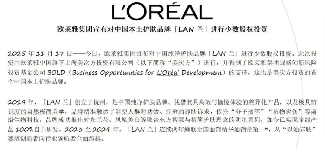 LAN兰的六年逆袭,是国货美妆抓住时代机遇的缩影——用精准的赛道卡位踩中风口,用“科技+美学”的叙事打动人心,用扎实的产品力赢得资本认可。欧莱雅的投资既是加冕,也是提醒:在流量红利渐消的时代,真正的品牌竞争力不在于短期销量,而在于长期价值的构建。
