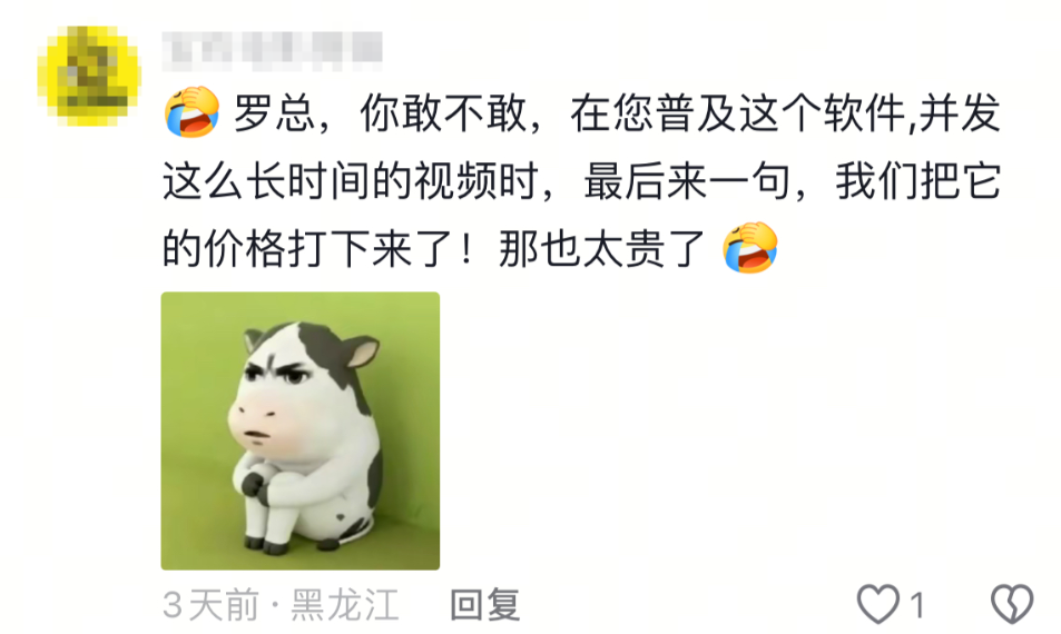 “罗总,你敢不敢,在您普及这个软件,并发这么长时间的视频时,最后来一句,我们把它的价格打下来了!那也太贵了”。