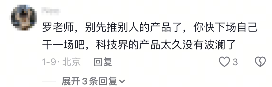 “罗老师,别先推别人的产品了,你快下场自己干一场吧,科技界的产品太久没有波澜了”。