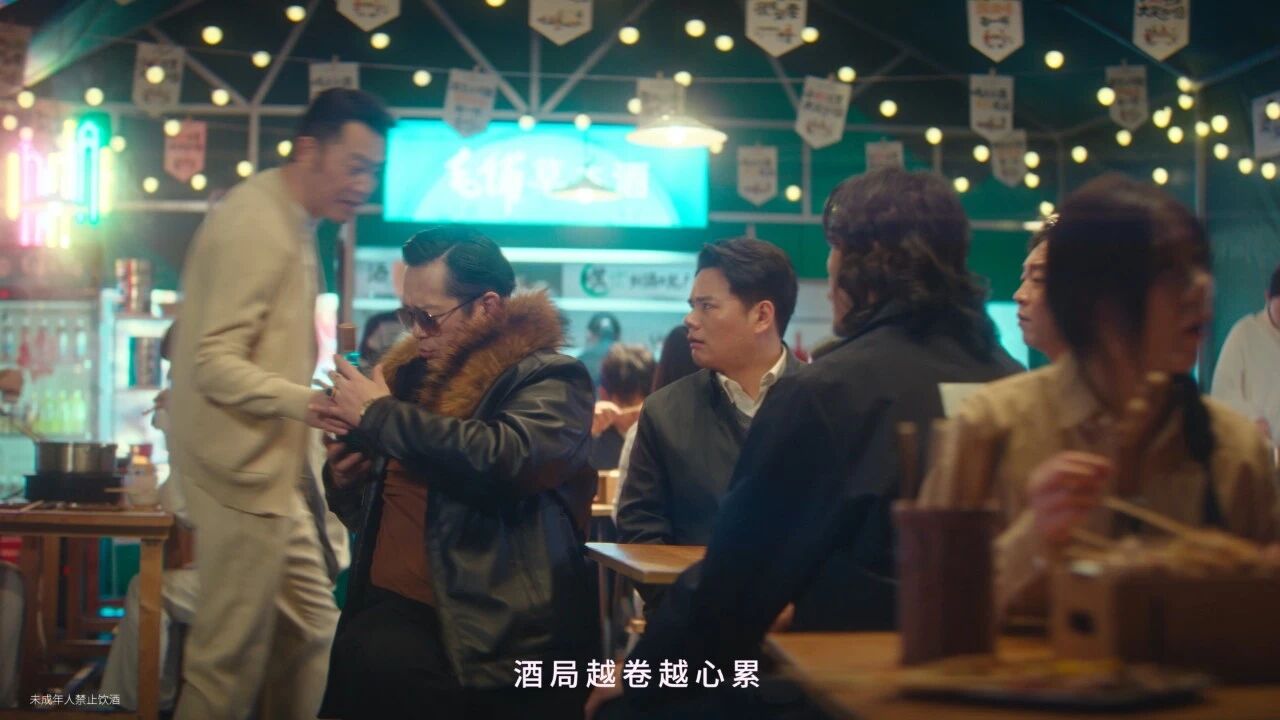 而在捕捉场景痛点之余,毛铺更是拿捏了消费者想要“打破常规”的情绪,所以沙溢在短片中的角色,正是在酒局中悄悄给大家“减负”的自己人。他的幽默有一种高情商的“巧劲儿”——能用一句玩笑化解劝酒攻势,能在不伤和气的情况下让紧绷的场面松弛下来。