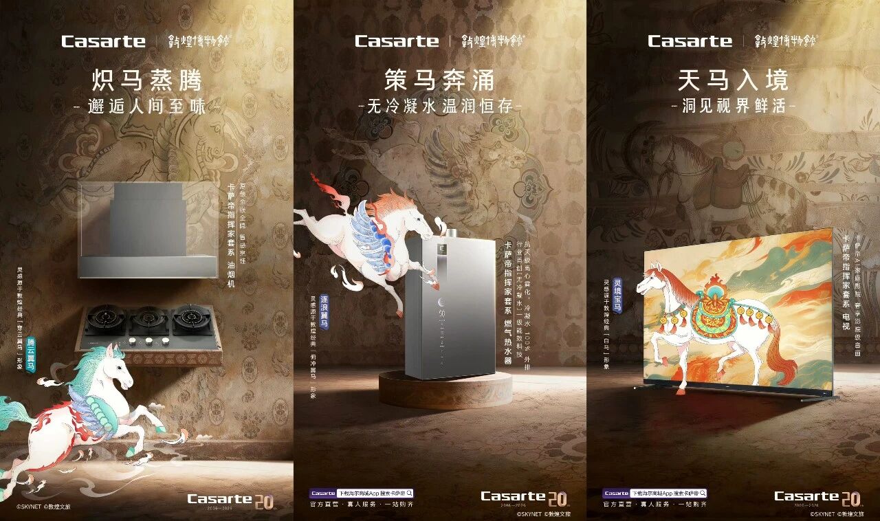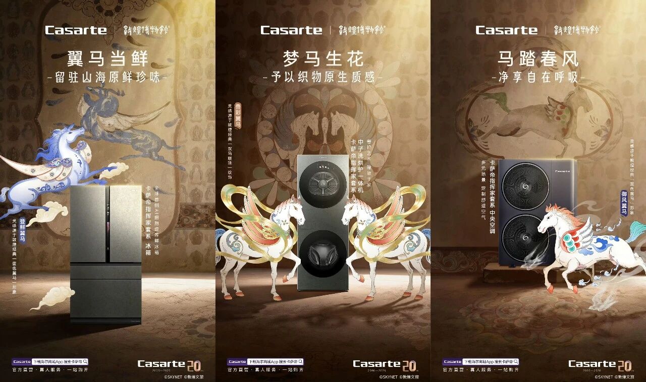 而以缔造“艺术家电+高端生活”著称的卡萨帝,则携手敦煌博物馆组了一个高端局——以蕴含美好生活期盼的敦煌「天马IP」为载体,联动6大家电,展开了一场千年文化技艺巅峰与AI原创科技巅峰的对话,也为我们呈现了一场与众不同的马年品牌叙事。