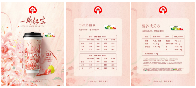 首先,霸王茶姬公开承诺使用原叶茶,还把配方成分都公开了,甚至发布了热量计算器,推出了ABCD营养分级体系,把产品的信息都透明化了。消费者能清楚地知道每一杯奶茶的成分和热量,这样在享受奶茶的时候,心理负担自然就变低了。