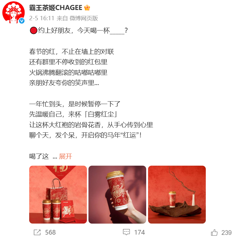 如果说,符号消费是驱动消费者购买的关键,那文化认同就是霸王茶姬和消费者产生深厚羁绊的关键。消费者能对一个品牌产生深度情感连接,文化认同算得上是一个重要因素,这也给霸王茶姬带来了文化资产和情绪价值的乘积效应。