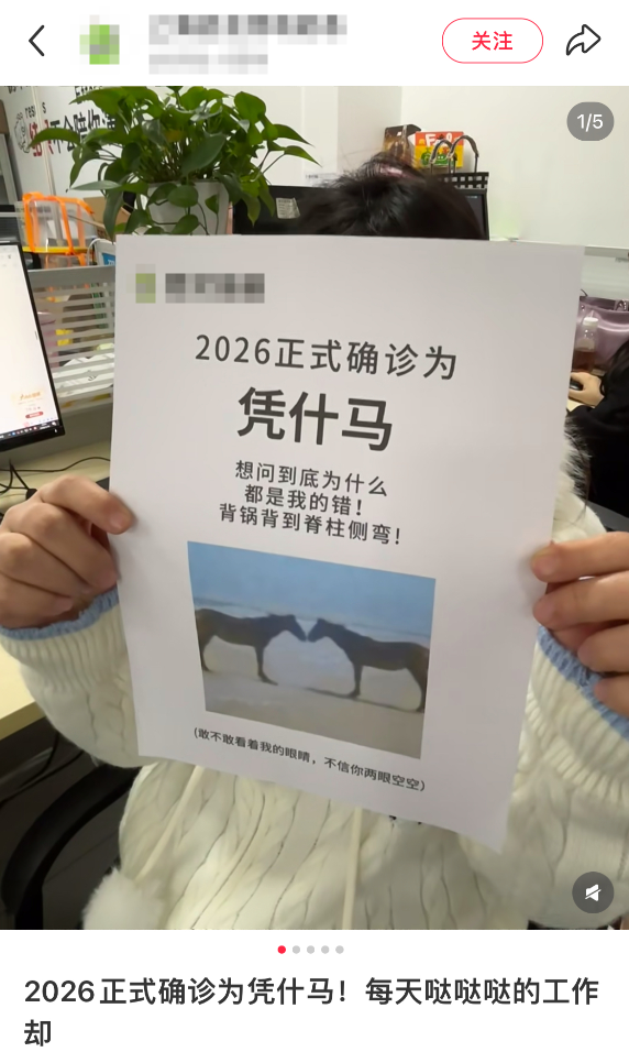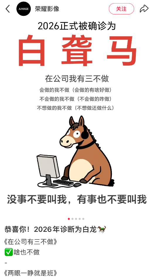 而在马年开始,打工人又玩起了“正式确诊为XX”的热梗,有意思的是,这波打工人不是简单的玩曾经的热梗与文字游戏,而是将自己与“牛马”元素绑定的同时,精准融合了自己在职场的状态与心理,是一种调侃,也是开工后集体用自嘲的口吻,应对假期后遗症的方式。