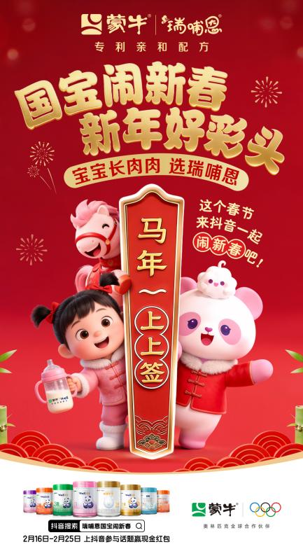 今年春节,蒙牛瑞哺恩精准锁定“春节+游灯会”这一亲子家庭高频聚集、情感浓度极高的线下场景,以国宝IP恩恩为主角打造首个「瑞哺恩国宝恩恩新春灯会」,吸引万千家庭打卡;在线上,抖音 #瑞哺恩国宝闹新春# 挑战赛,让无法到场的用户也能与它云合拍,斩获近5亿曝光,共创参与量超1.1万。