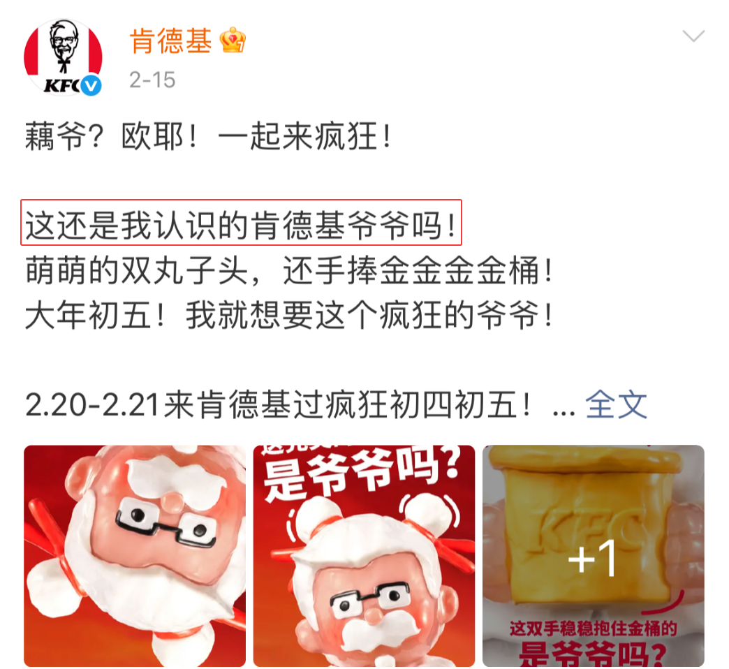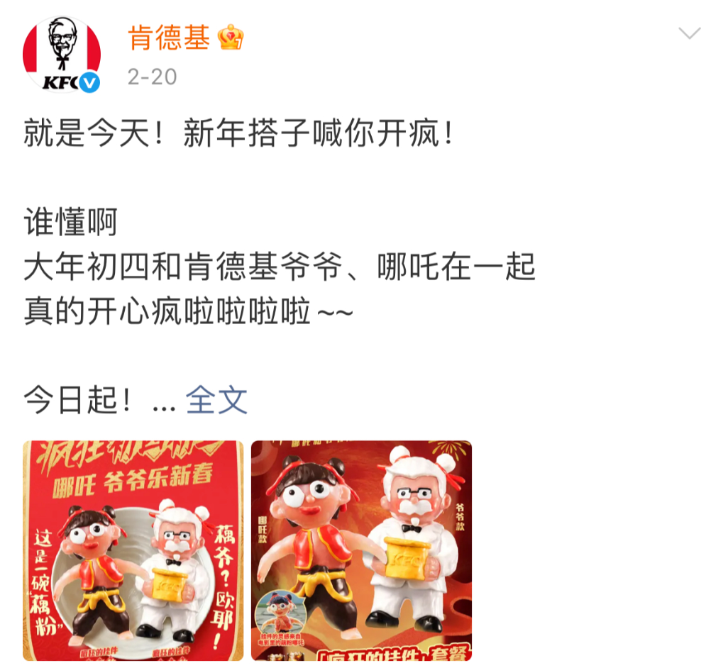 为了让自身形象与哪吒的联名形象更加契合,肯德基也给自家的爷爷来了一个新年大变身,还在微博上自己玩梗:这还是我认识的肯德基爷爷吗!