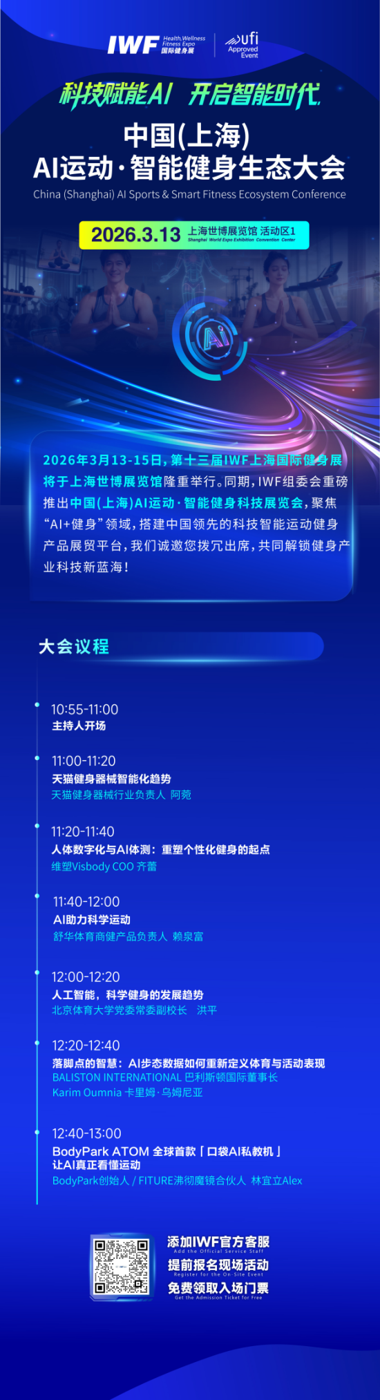 3月13日,天猫健身器械行业负责人将在IWF上海国际健身展的AI运动·智能健身生态大会上发布《天猫健身器械智能化趋势》,携手行业专家、品牌方、技术服务商共同探讨AI+健身的行业发展新方向。