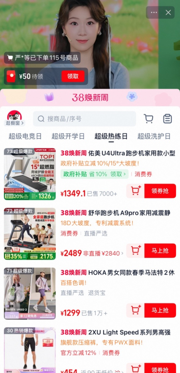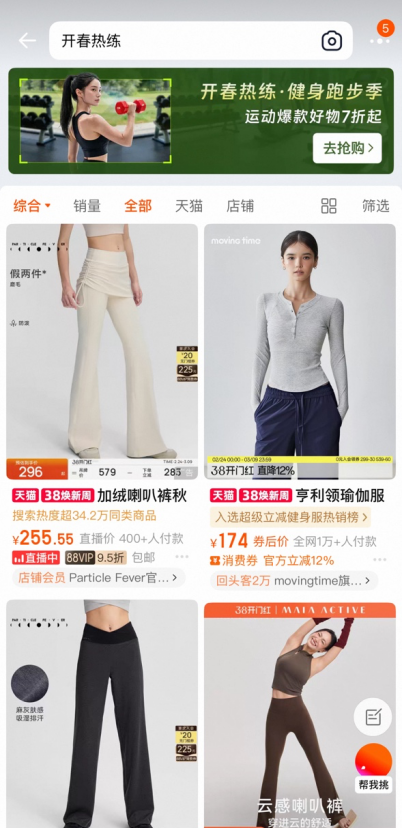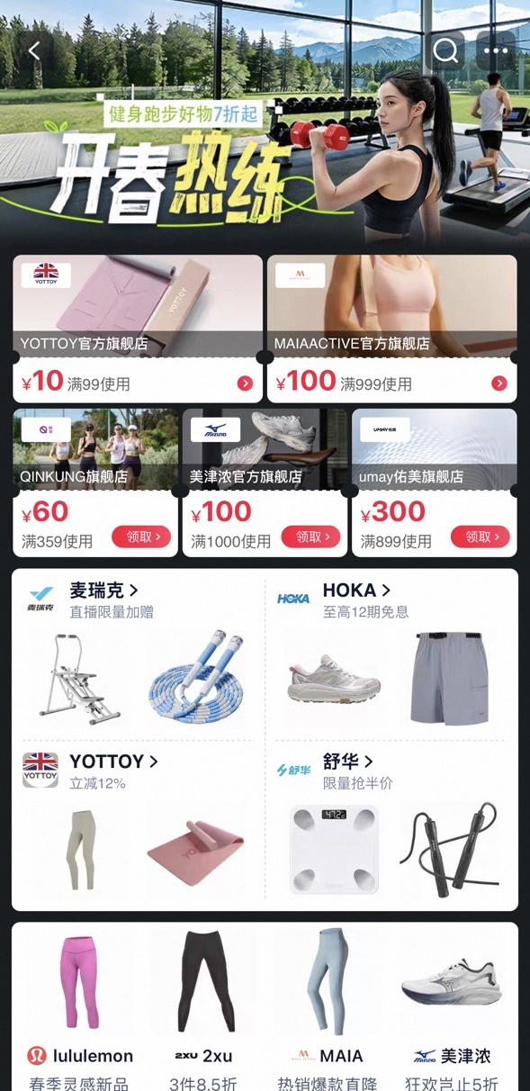 在“天猫超能主场”的统筹下,天猫运动户外能打破品牌、活动、平台单打独斗孤岛效应,能够充分整合站内外资源。像是官方发布的趋势先导片《开春去热练》,交个朋友、陈洁、烈儿直播间等接力开播持续种草,淘宝APP开春热练的会场和搜索资源,淘宝APP开屏、淘金币会场TAB3“开春热练季”资源、分众梯媒以及小红书资源等等….丰富的站内外资源,让开春热练的热爱在3月持续点燃。