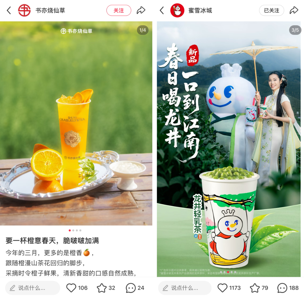 比如,书亦烧仙草就选择把春天与一日店长CP结合,蜜雪冰城采用春日+雪王IP,让春日营销的表达更丰富,也增加了春日营销的叙事方式,还让品牌与更广泛的用户产生了连接。