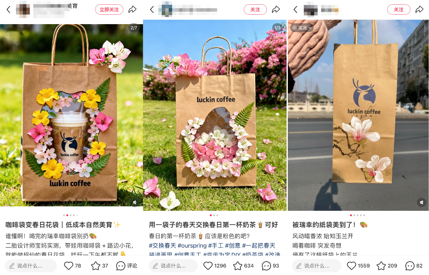 比如有人将春天与瑞幸的纸袋联系到一起,在网上形成了“把春天装进口袋”的春日营销;有网友帮瑞幸“更新”春日主题手提袋,还有人将春天“装进”杯子里……花式留住春天的方式。