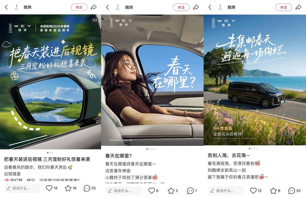其春日营销的高明之处就在于,没有生硬地凸出产品的能力,而是用后视镜构建了一个让用户自由联想的春日场景。当用户分享自己后视镜里的春天时,就让他们的分享不仅是风景,更是一种生活方式和心境,且魏牌则作为这段美好旅程的陪伴者和见证者,承载着家庭欢乐、实现春日远行的功能,也自然融入到了用户的记忆中,也凸显了品牌“探索”、“自由”、“发现美好”等文化特质。