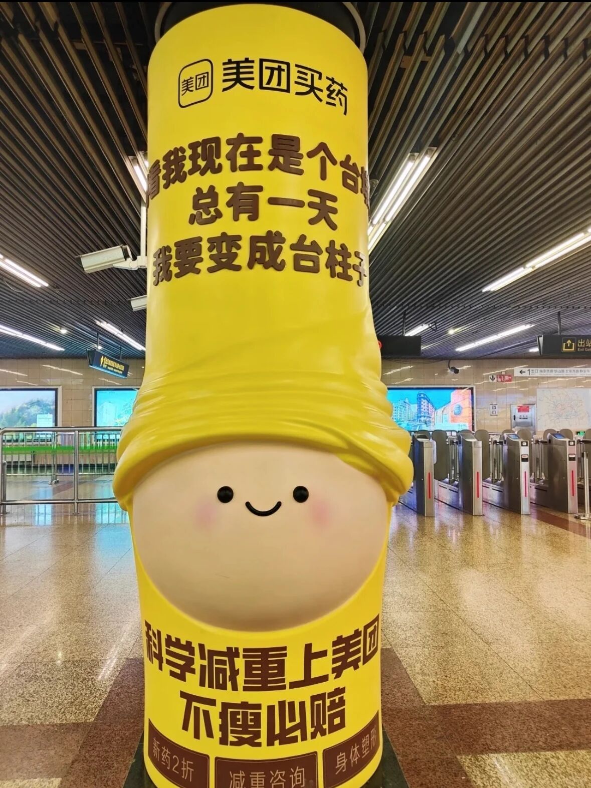 通勤路上大多数人本来只想刷手机,结果眼睛被迫“吃创意”,连无聊的资格都没了,对,说的就是美团买药让地铁柱子“成精了”的广告!
