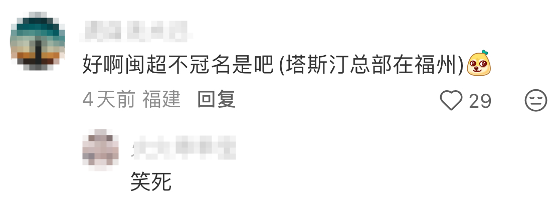 关注苏超的网友喊话塔斯汀与苏州队合作,福建的网友开始不淡定了,表示塔斯汀要冠名闽超,因为其总部在福州。这就抢上了?