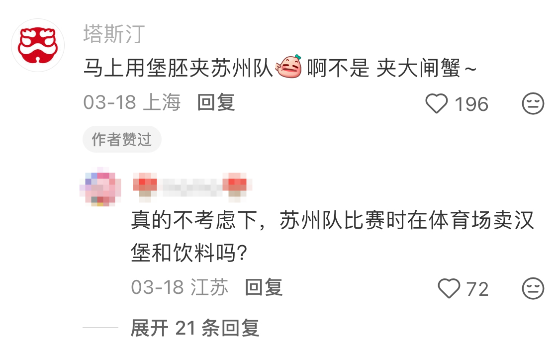或许网友的“倒逼”有效,塔斯汀品牌开始下场玩自己的梗,表示“马上用堡胚夹苏州队,啊不是 夹大闸蟹”,与网友玩在一起。有网友在帖子下建议,“真的不考虑下 ,苏州队比赛在体育场卖汉堡和饮料吗?”