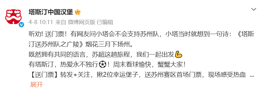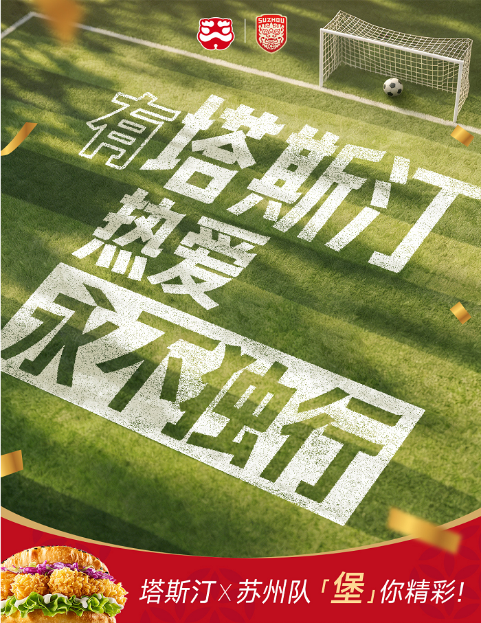 在4月8号,正式表示“听劝”与苏州队合作,其海报采用了足球的绿荫场,文案“有塔斯汀,热爱永不独行”。